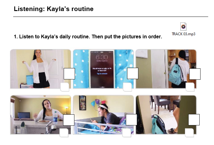 Escuchen las rutinas de Kayla. Luego pongan las fotos en orden.